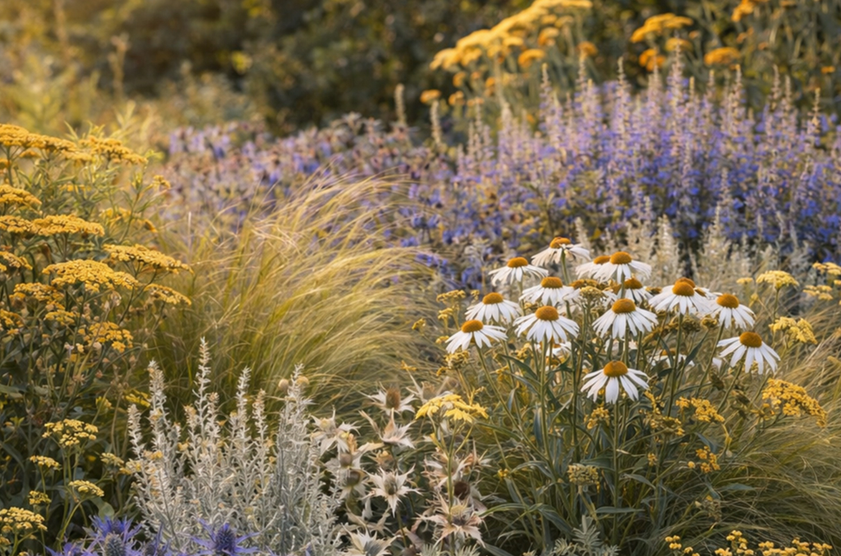 Bring your garden to life with a beautifully composed, naturalistic planting design that captures a relaxed, free-flowing style. Featuring a harmonious blend of soft yellows, crisp whites, gentle purples, and fresh green tones, this scheme is designed to create a sense of movement and effortless beauty throughout the space.